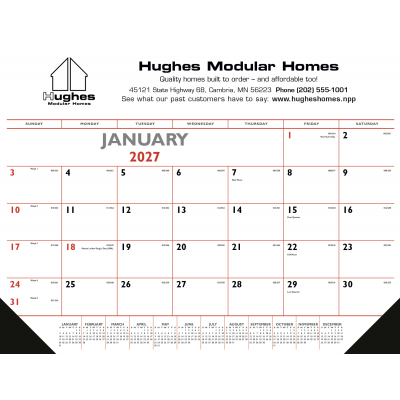 This desk pad keeps your name and logo in front of your client all day every day. The vinyl corners provide an attractive way to make the product durable. The grid includes the Julian dates.